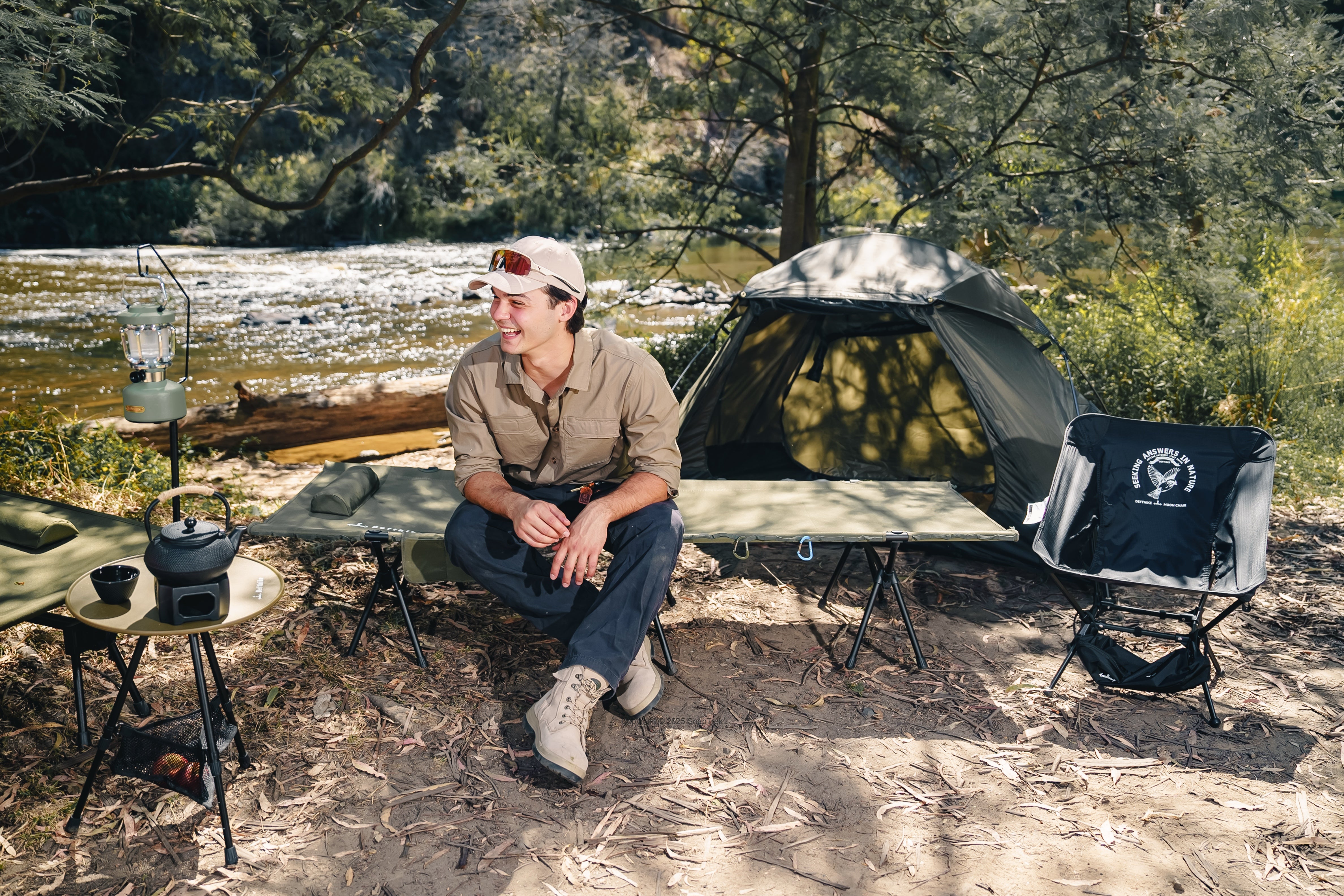 The Solo Camp Stretcher offers exceptional comfort and durability with a 7075 aluminium alloy frame and 900D Oxford cloth. It supports up to 150kg and features a built-in Velcro pillow, tactical hanging bag, and side storage pockets for convenience. Available in high and low guard configurations, it packs down to 51 × 19 × 19 cm for easy transport and weighs just 3.4kg.